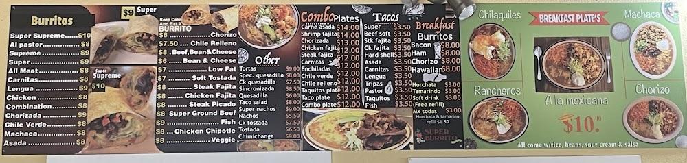 Super Burrito's menu highlights various traditional Mexican dishes. Burritos, tacos, and quesadillas reign supreme. Breakfast options feature classic Mexican flavors to start the day right.